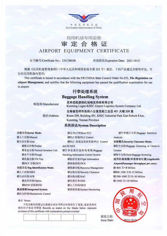 中國(guó)民航局授予的集成資格審定合格證