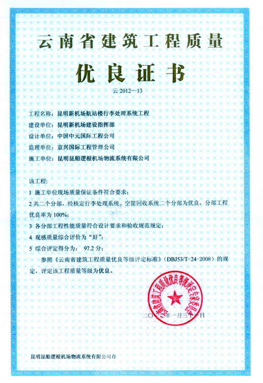 云南省建筑工程質(zhì)量?jī)?yōu)良證書(shū)